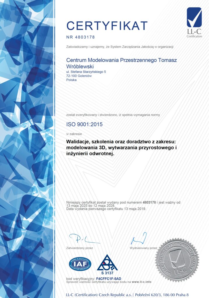 Instructor, MathGwarancją najwyższej jakości naszych procesów szkoleniowych i technicznych jest wdrożony, system zarządzania jakością zgodny z normą ISO 9001:2015 w zakresie prowadzenia walidacji, szkoleń oraz doradztwa z modelowania, skanowania oraz druku 3D.